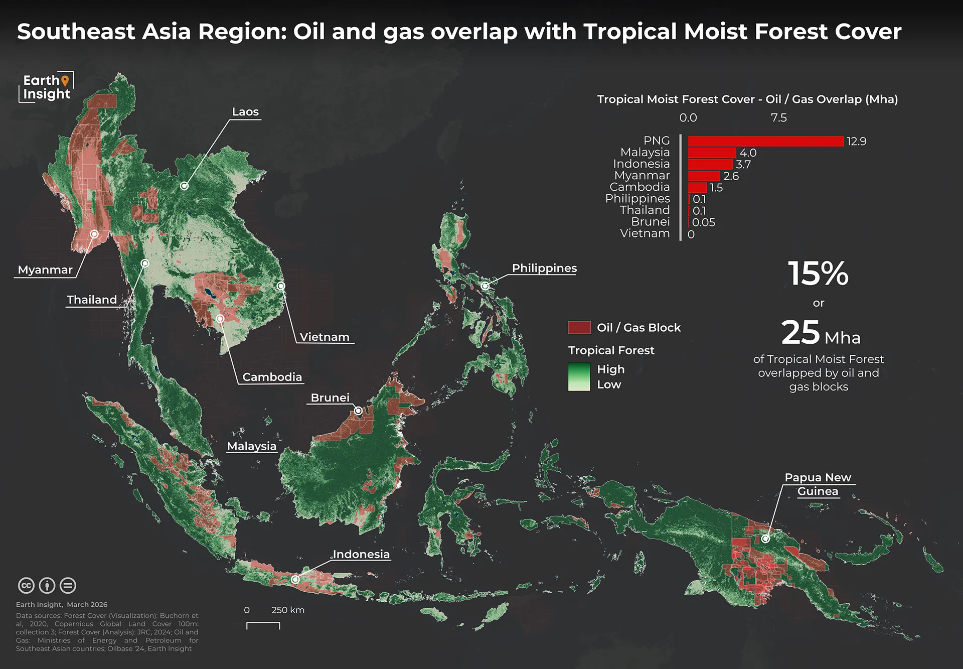 The stakes for getting this right are enormous. Research shows that oil and gas blocks already overlap with approximately 179 million hectares of tropical moist forests – roughly 21% of the Amazon, Congo Basin, and Southeast Asian forest cover.