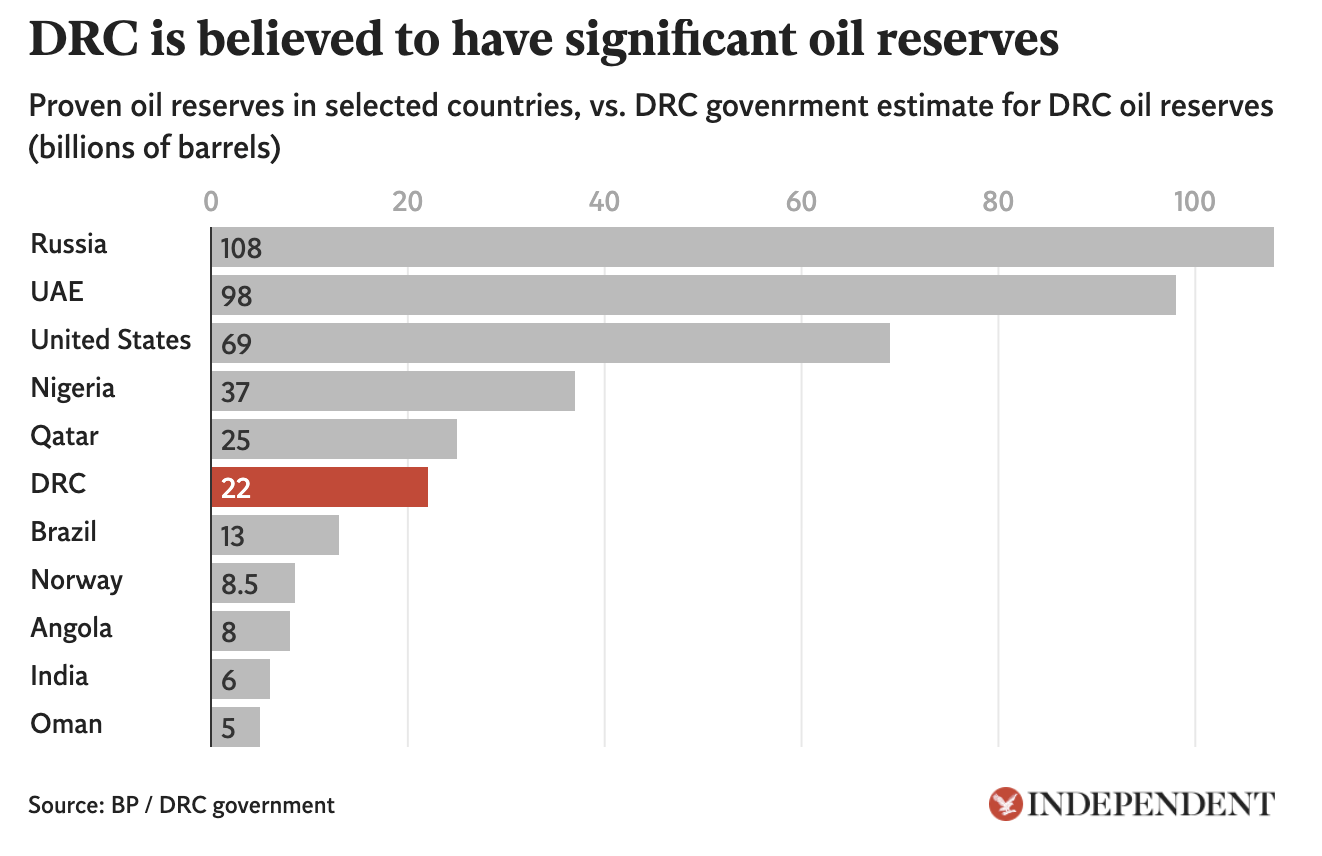 Proven oil reserves in selected countries, vs. DRC govenrment estimate for DRC oil reserves (billions of barrels)